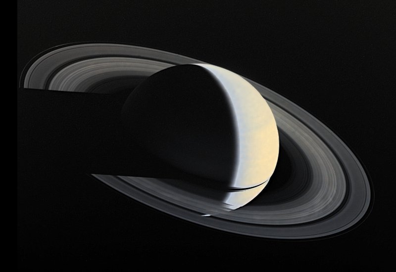 Voyager 1 image of Saturn and its ring taken Nov. 16, 1980 four days after closest approach to Saturn, from a distance of 5,300, 000 km (3,300,000 miles). This viewing geometry, which shows Saturn as a crescent, is never achieved from Earth. The Saturnian rings, like the cloud tops of Saturn itself, are visible because they reflect sunlight. The translucent nature of the rings is apparent where Saturn can be seen through parts of the rings. Other parts of the rings are so dense with orbiting ice particles that almost no sunlight shines through them and a shadow is cast onto the yellowish cloud tops of Saturn, which in turn, casts a shadow across the rings at right. The black strip within the rings is the Cassini Division, which contains much less orbiting ring material than elsewhere in the rings. (ID: PIA00335)