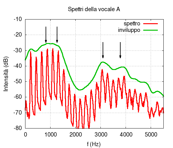 Spettro medio della vocale A, suo inviluppo (spettro calcolato con una diversa finestra temporale), e formanti LPC