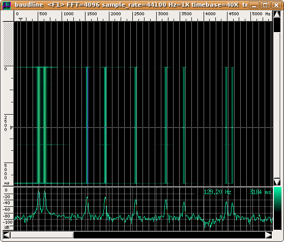 Spettrogramma dalla sovrapposizione di due onde triangolari a 512 e 640 Hz (in rapporto cioè di terza maggiore naturale). Il reticolo evidenzia i multipli della frequenza corrispondente al terzo suono (suono differenza a 128 Hz)