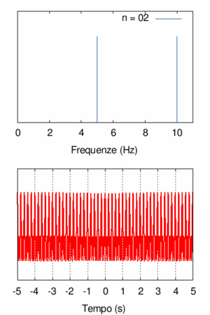 Nel secondo esperimento vogliamo sperimentare una situazione differente: studiamo un segnale di larghezza di banda data (per fissare le idee diciamo da 0 a 10 Hz), e studiamo cosa succede infittendo le componenti spettrali all'interno di questa banda. Quindi costruiamo la sequenza di segnali ... n. Si osservi che i segnali sono ancora sommati secondo la prescrizione del Teorema di Fourier cioè tutte le frequenze sono multiple di una frequenza fondamentale che ora però vale, quando si sommano n armoniche, Visualizziamo graficamente il risultato al variare di n nell'animazione qui a fianco. All'aumentare del numero di componenti n osserviamo che: