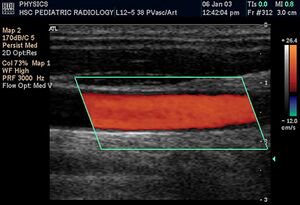 Essa però non è in grado di valutare le ripercussioni emodinamiche (cioè sul flusso effettivo del sangue) che hanno tali anomalie morfologiche; per ovviare a tale limite diagnostico l'ecografia viene utilizzata assieme alla tecnica Doppler la quale permette anche la visualizzazione delle parti in movimento (in questo caso il flusso del sangue). Tale tecnica si basa sullo spostamento in frequenza che subiscono le onde riflesse da corpi in movimento; tale spostamento dipende dalla velocità del corpo riflettente e quindi fornisce una "mappatura" delle diverse velocità del flusso sanguigno nei vari punti della sezione del vaso. Gli aspetti quantitativi di tale spostamento in frequenza sono ben descritti nelle pagine relative all'effetto Doppler. Nell'immagine a lato le parti "biancastre" rappresentano il vaso sanguigno; in rosso è stato colorato il flusso sanguigno. Esistono tecniche di visualizzazione (utilizzate nell'esame denominato Eco-color Doppler) più raffinate che associano alle diverse velocità del flusso sanguigno un colore diverso. Approfondimenti e collegamenti