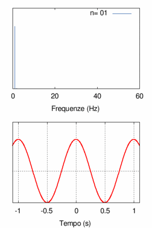 Nel secondo esperimento vogliamo sperimentare una situazione differente: studiamo un segnale di larghezza di banda data (per fissare le idee diciamo da 0 a 10 Hz), e studiamo cosa succede infittendo le componenti spettrali all'interno di questa banda. Quindi costruiamo la sequenza di segnali ... n. Si osservi che i segnali sono ancora sommati secondo la prescrizione del Teorema di Fourier cioè tutte le frequenze sono multiple di una frequenza fondamentale che ora però vale, quando si sommano n armoniche, Visualizziamo graficamente il risultato al variare di n nell'animazione qui a fianco. All'aumentare del numero di componenti n osserviamo che: